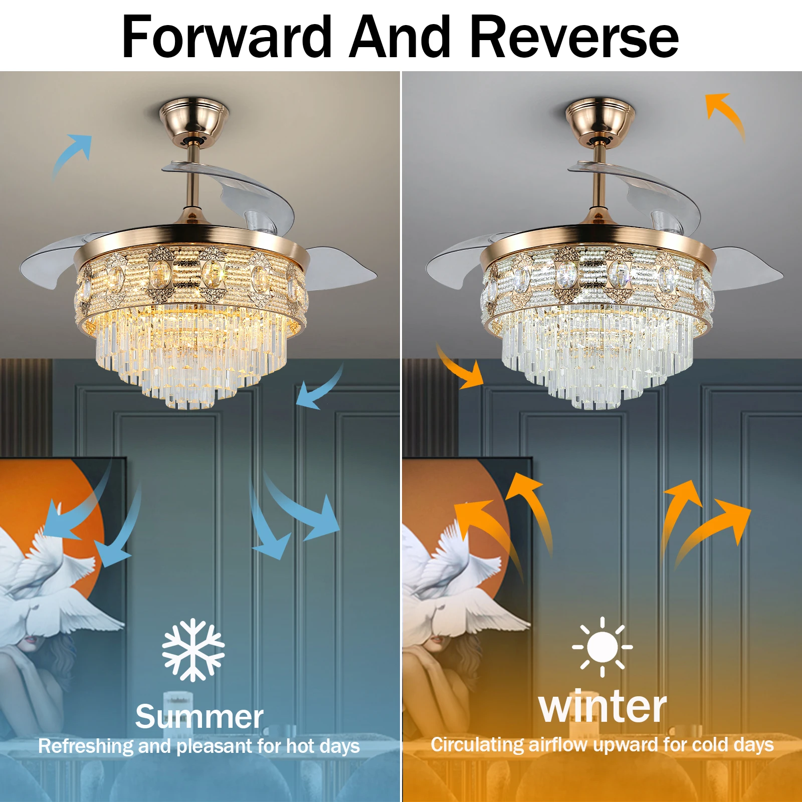 Elevate your space with our Decorative Intelligent Remote Control Smart Ceiling Fan With Light. Crafted with precision using a professional plating and polishing process, this gold fandelier not only adds a touch of luxury but also ensures durability by preventing metal rust. The five layers of long-prismatic K9 crystals beneath the retractable blades create a mesmerizing play of light, offering an extraordinary lighting experience.