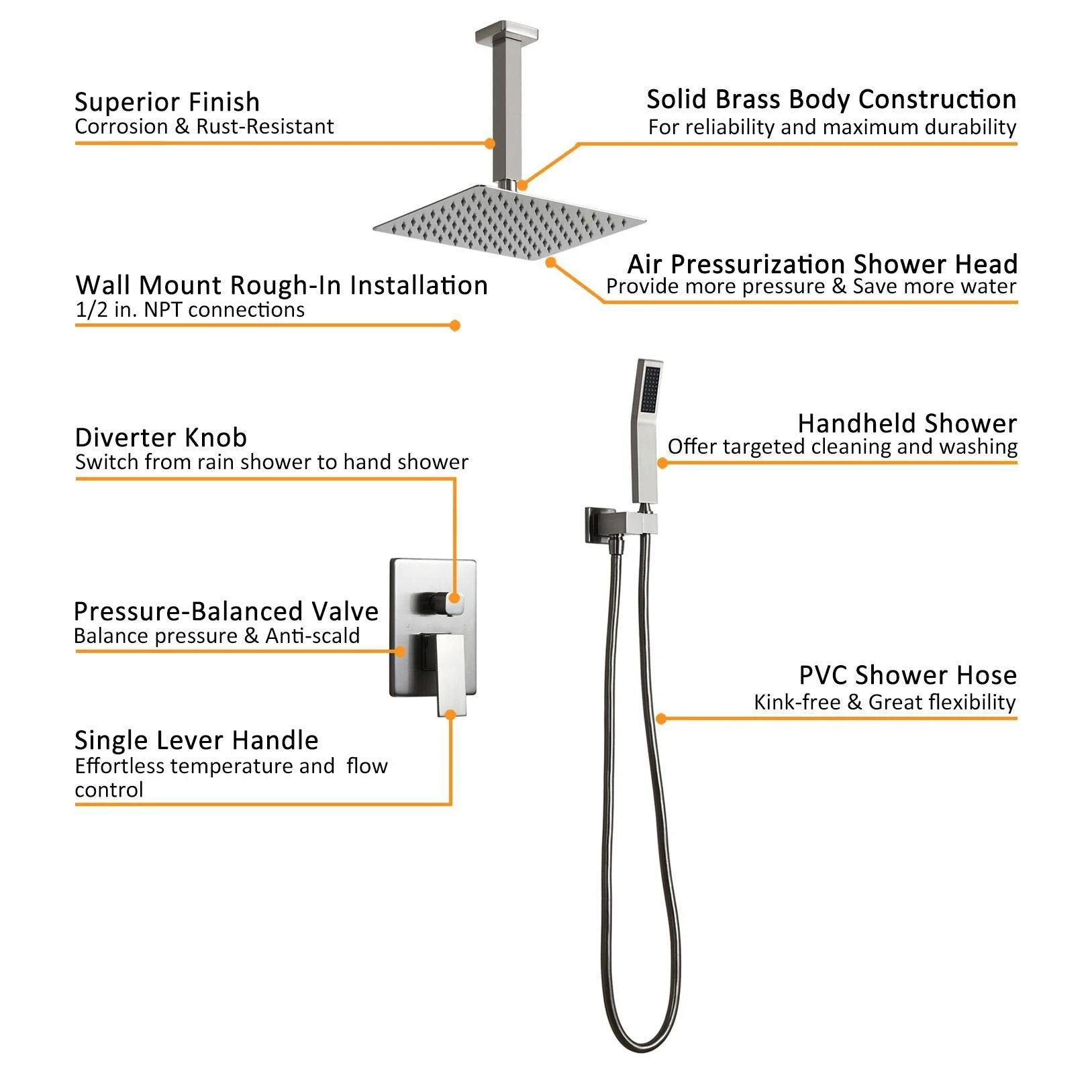 – Includs 10″ (250mm) rain shower head, ceiling mount shower arm, hand shower parts and 2-function valve.