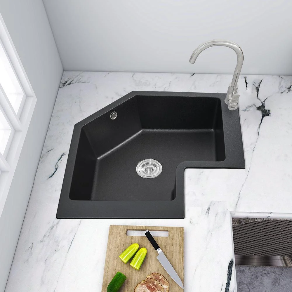 Featuring a single bowl configuration in a drop-in installation format, this Irregular quartz kitchen sink combines fashion with function to create a contemporary look for the kitchen. It__ designed to fit in a preexisting corner and creates more working space. This sink can free up space which can make your area seem bigger. Crafted from premium material for maximum durability, a deep basin accommodates glasses and barware with ease. The clean lines and special design complement every style preference, from traditional to transitional to modern. This elegant kitchen sink is equipped with top-level soundproofing, including thick rubber dampening pads. The sink is additionally treated with a protective coating that reduces condensation and further dampens sound. The corrosion-resistant surface is further protected from rust and oxidation by a meticulous finishing process. Commercial-grade satin finish and gently rounded corners make maintece as simple as wiping the surface with a damp cloth. For easy installation, all mounting hardware is provided.