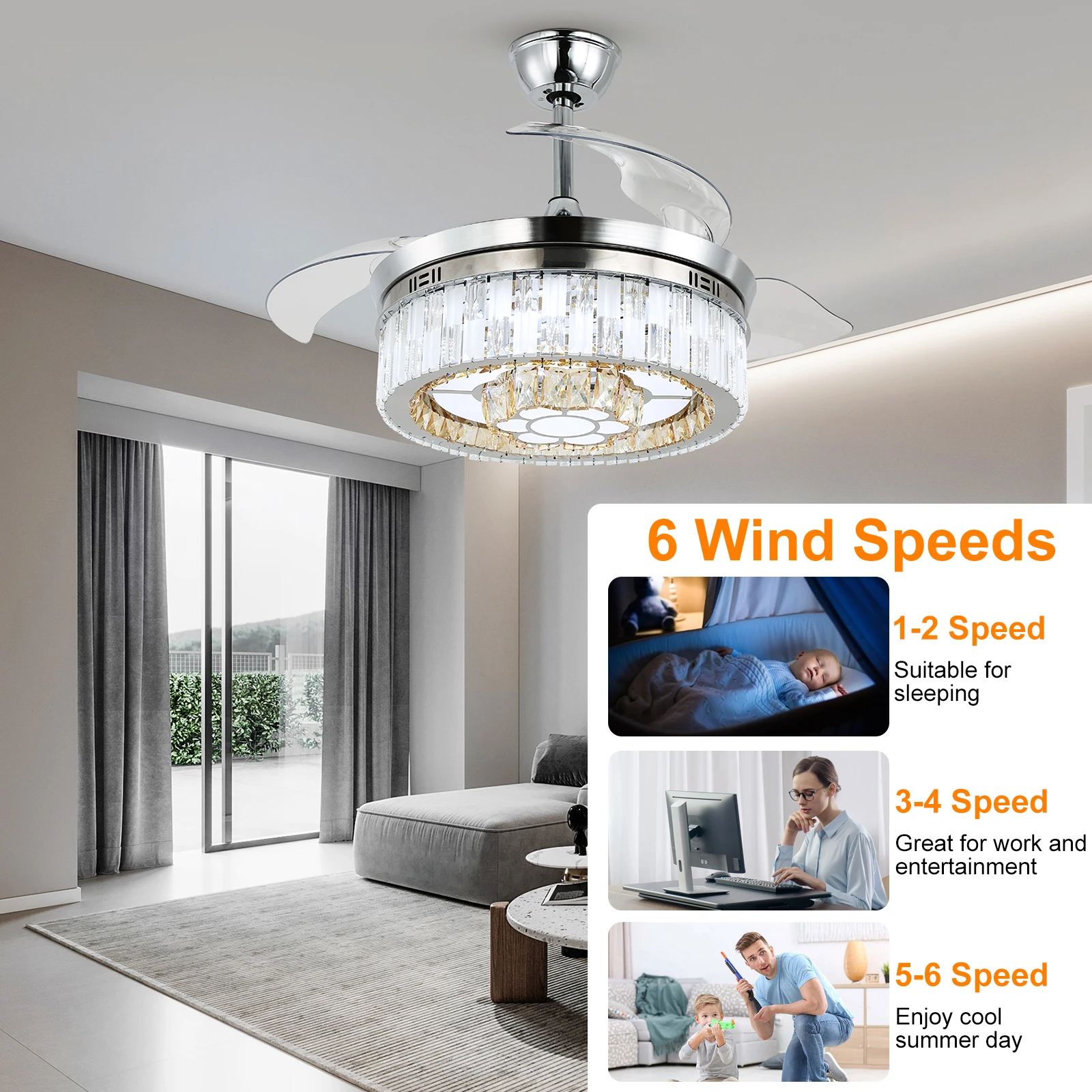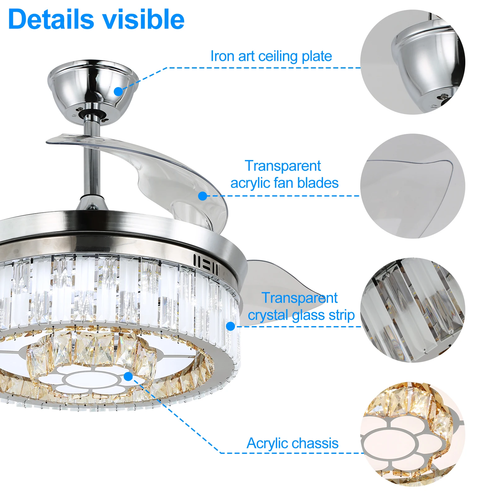 Elevate your home atmosphere with our Changeable 3 Blades Ceiling Fan, a perfect blend of functionality and elegance. Crafted with precision using a professional plating and polishing process, this fan ensures durability by preventing metal rust, promising a lasting service life. The five layers of long-prismatic K9 crystals beneath the retractable blades create a crystal-clear spectacle, reflecting charming lights and offering an extraordinary lighting experience.