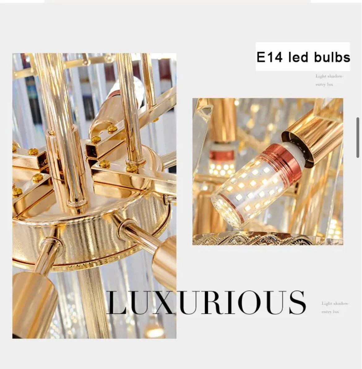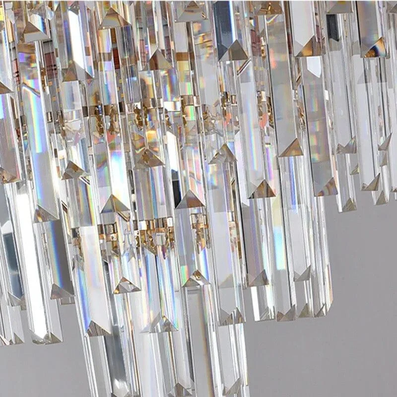 The chandelier is expertly crafted from high-quality materials and features a sturdy metal frame that is plated with a sleek chrome finish. The circular tiers are adorned with a multitude of faceted crystals that reflect and refract light to create a dazzling display of sparkling illumination.
