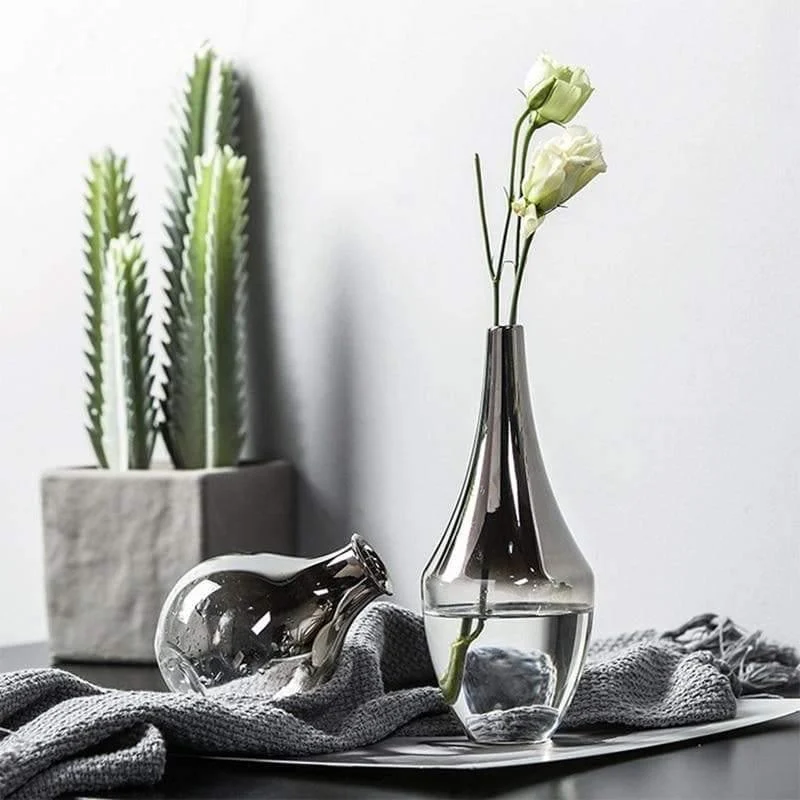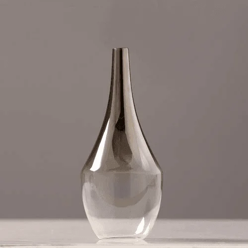 Elevate any room with a touch of elegance and charm. Our stunning silver and glass vases are the perfect addition to any space, featuring a transparent base with a beautiful gradient silver design on the neck and shoulders. Whether you use it to hold flowers or display it on an accent table or console, these gorgeous vases are sure to become the focal point of any room.